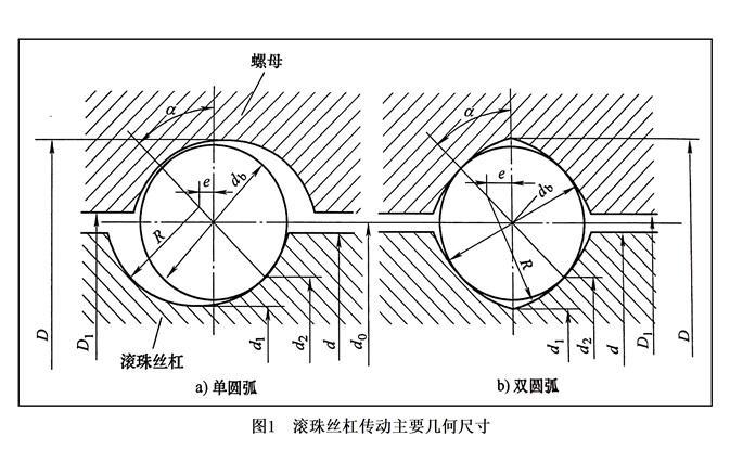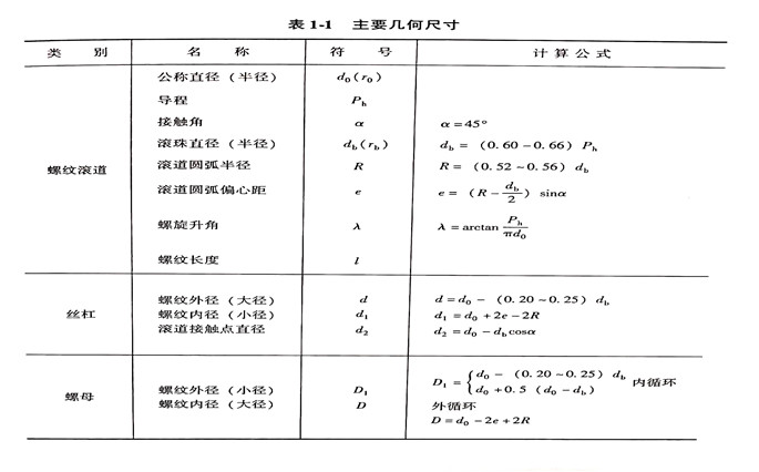 滾珠絲杠傳動(dòng)主要幾何尺寸如圖1-17所示,其尺寸計(jì)算列于表1-1。
