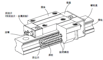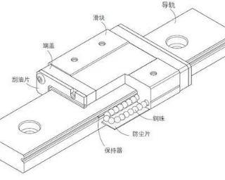 滾動直線導(dǎo)軌副一般由導(dǎo)軌、滑塊、滾動體、返向器、保持架、密封端蓋及擋板等組成,以滑塊和導(dǎo)軟間的滾動體滾動代替相對接觸滑動。當(dāng)導(dǎo)軌與滑塊做相對運(yùn)動時,滾動體將沿著導(dǎo)軌上的經(jīng)過溶硬和精密磨削加工而成的滾道滾動,在滑塊端部滾動體又通過返向裝置(返向器)進(jìn)入返向孔后再進(jìn)入滾道,從而使得滾動體周而復(fù)始地進(jìn)行滾動運(yùn)動。返向器兩端裝有防塵密封端蓋,可有效地防止灰塵、屑末進(jìn)入滑塊內(nèi)部。