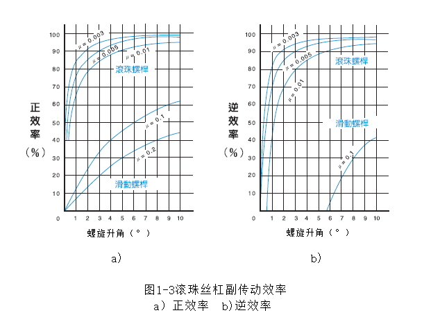 滾珠絲杠副傳動的摩擦系數(shù)經(jīng)試驗(yàn)測得,一般為0.0025-0.0035,其傳動摩擦阻力大幅減小,傳動效率得 到很大提高。如圖1-3所示,當(dāng)摩擦系數(shù)μ=0.003、螺旋升角λ=2°時(shí),傳動效率可達(dá)90%以上;當(dāng)螺旋升角λ=3°時(shí),傳動效率可升至95%以上; 當(dāng)λ繼續(xù)增大時(shí),傳動效率的理論值可高達(dá)98%,但其速率增加的緩慢。滾珠絲杠副傳動效率相當(dāng)于滑動螺旋傳動的2~4倍,滾珠絲杠傳動相對滑動螺旋傳動來說,能以較小動力推動較大負(fù)荷,而功率消耗只有滑動螺旋傳動的1/4~1/2,不僅能大幅減輕操作者的勞動強(qiáng)度,而且對機(jī)械小型化、起動后顫動和滯后時(shí)間的減少以及節(jié)省能源等方面都具有重要意義。