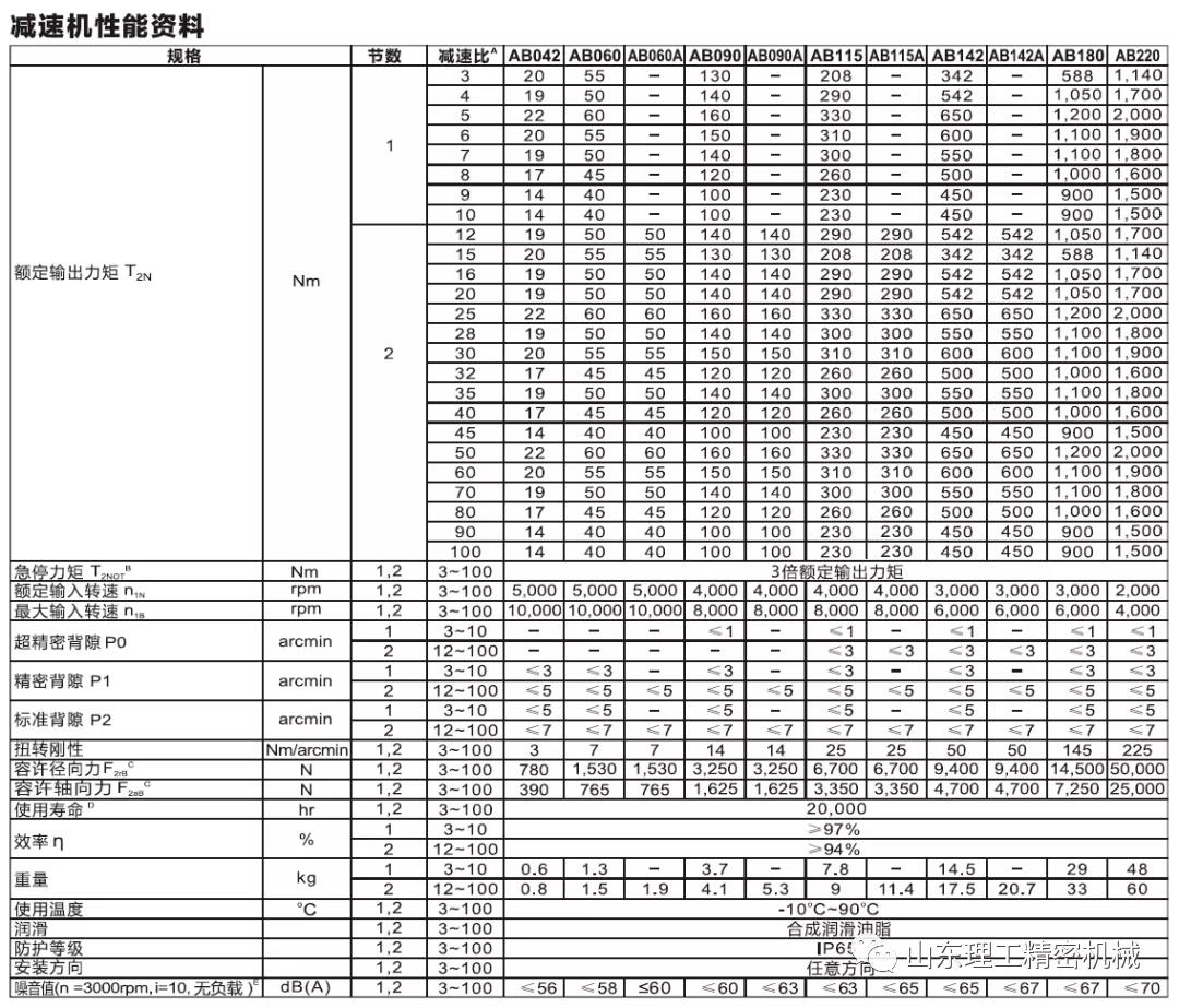 例如上圖的樣本中,減速機(jī)的型號(hào)為:AB042-單節(jié),我們?cè)谶x擇的時(shí)候,需要注意幾個(gè)地方,第一就是看減速機(jī)的外形,例如上式中的042,其實(shí)外形尺寸為42*42mm,這個(gè)時(shí)候注意去和你的伺服電機(jī)的外形做比較,通常我們選擇外形相當(dāng)?shù)臏p速機(jī)就可以了。